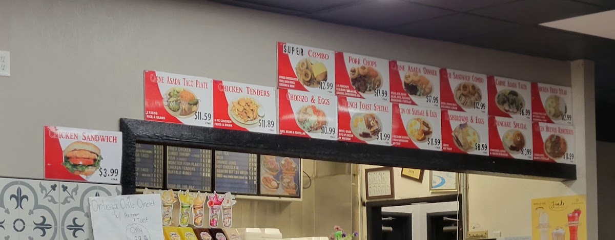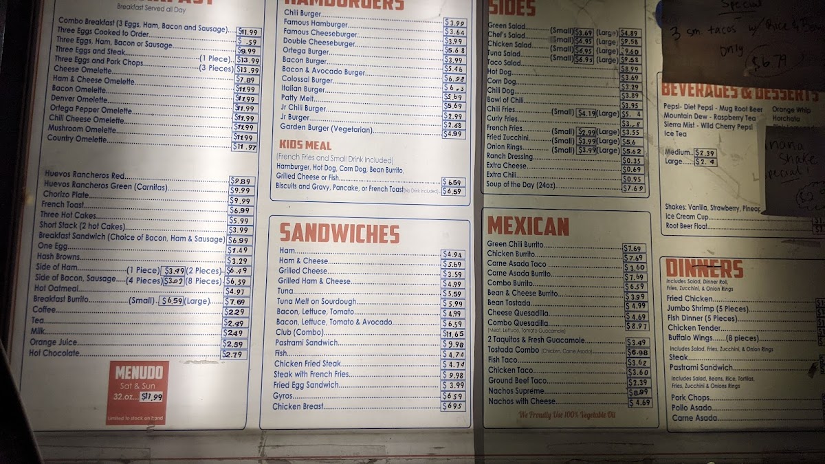 - Breakfast: Includes classic breakfast offerings such as burritos, scrambled eggs with hash browns and bacon, and specialty items like the Breakfast Burrito and Menudo (available on Saturdays and Sundays only).